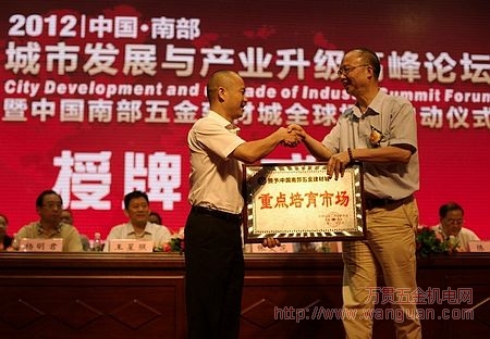 全国工商联五金机电商会负责人劳健斌向南部五金建材城授牌