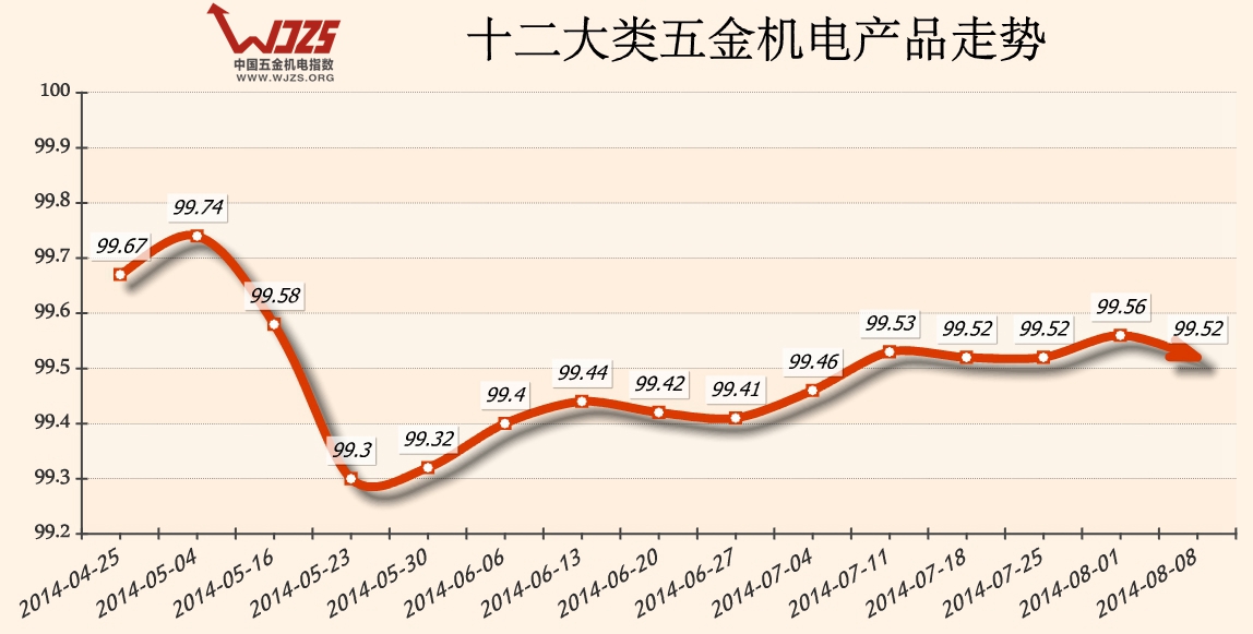 本期(2014/08/08期)“中国·成都五金机电指数”(以下简称“五金机电指数”)价格总指数收于99.52点,较前期回落0.04个百分点。