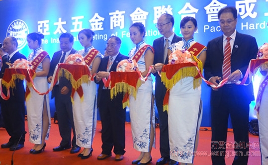 亚太五金商会联合会名誉主席吴石川、中华全国工商联合五金机电商务会负责人劳建斌等为亚太五金商会联合会成立剪彩