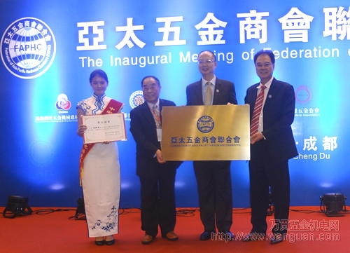 成都万贯集团董事长陈清华同林权兴、陈森茂共同担任亚太五金商会联合会副会长