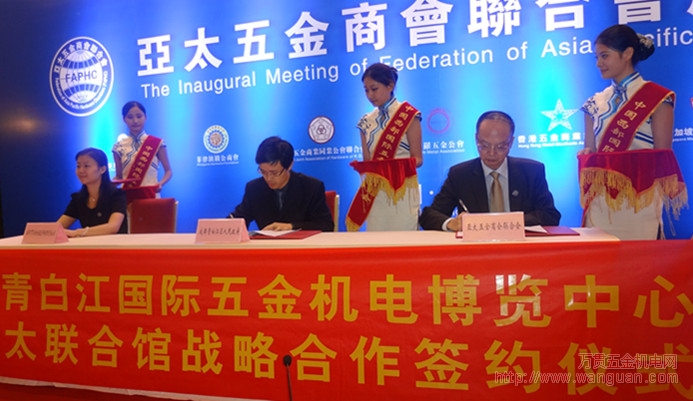 本次成立大会上,亚太五金商会联合会、成都市青白江区人民政府、万贯五金机电配送大市场三方共同签署了共建中国青白江国际五金机电博览中心暨亚太联合馆战略合作协议。