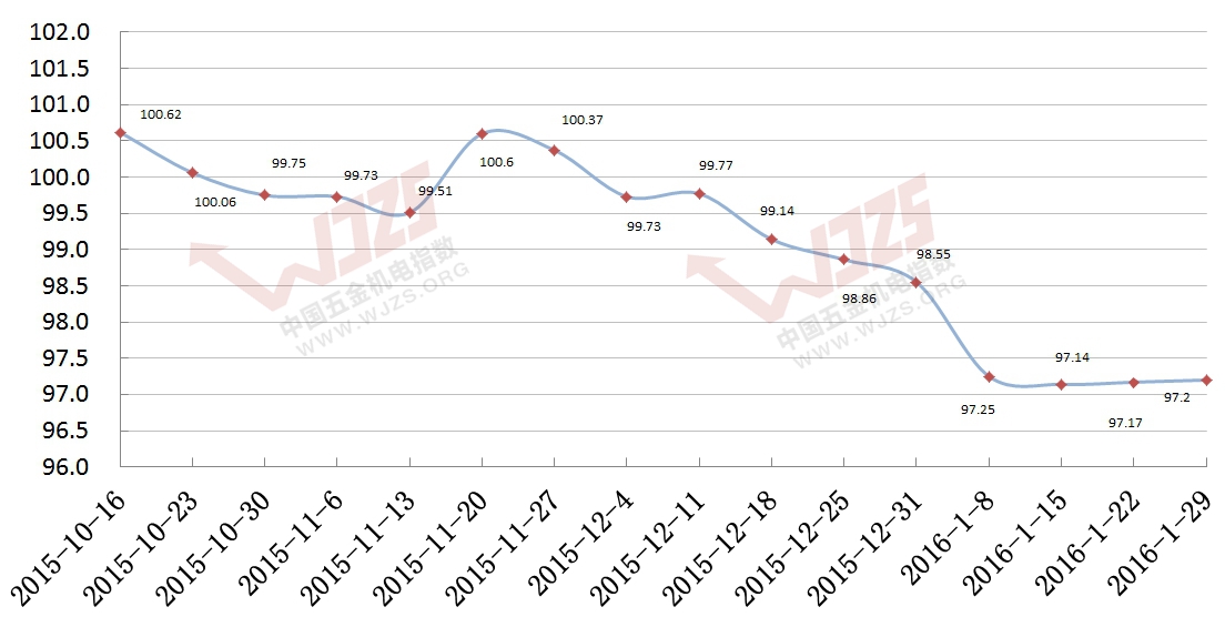 据对成都五金机电市场价格监测显示,2016年2月第1期“中国•成都五金机电价格总指数”为97.20点,(以2011年12月底为基期,基点为100),与上周相比再度回升0.03点,与去年同期相比则下跌2.14点,环比微升走势企稳。组成“中国•成都五金机电价格总指数”的12大类价格指数呈现“3涨3跌6平”的态势。其中【安防设备与用品】、【五金材料】、【五金零部件】三类本期价格指数分别为:87.79、90.55和96.93点,环比分别上升0.29、0.11和0.05点;而【五金工具】、【电工电气】、【机械设备】三类价格指数分别为:98.35、97.85和98.01点,环比分别下跌0.07、0.01和0.01点;其他【电线电缆】、【照明用具】、【仪器仪表】等六大类本期价格指数无变化。从十二大类价格指数涨跌数据看以看出,本期各类涨跌幅度都非常小,春节将至各类价格指数都基本持平前期,节前平稳收尾。