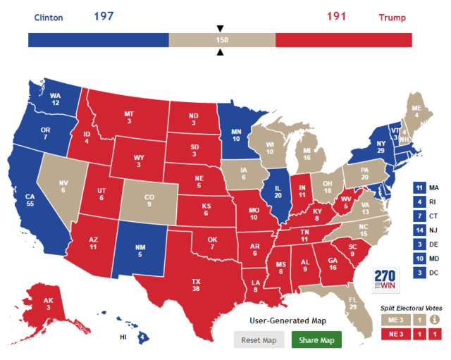预计特朗普能获得191张选举人票,希拉里则可以拿下197张,还有150张选举人票在摇摆之中,难以确定。