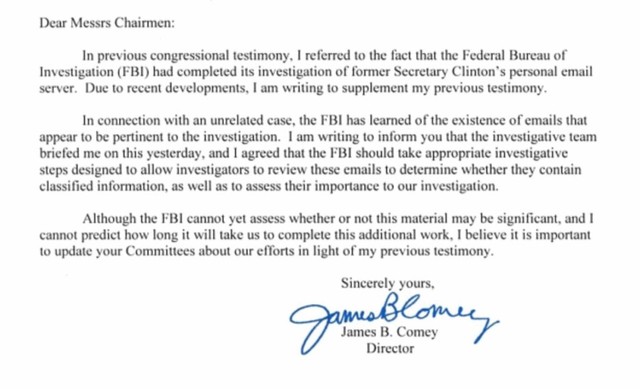 科米28日在发送给国会高层的信中说,联邦调查局在另一起与希拉里无关的调查中,发现了一些看起来与希拉里“邮件门”调查相关的新邮件。得知情况后,自己“同意联邦调查局采取适当调查步骤”,以确定这些邮件是否包含机密信息并评估其对“邮件门”调查的重要性。