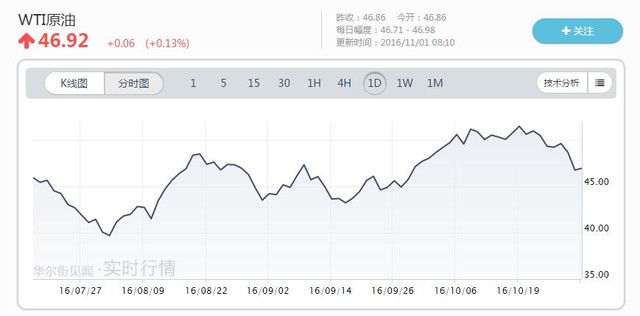 冻产协议达成后油价瞬间大涨近6%,随后维持了一波涨幅,一度涨至52美元/桶附近。10月中开始,油价有所回落,当前WTI涨0.13%至46.92美元/桶。