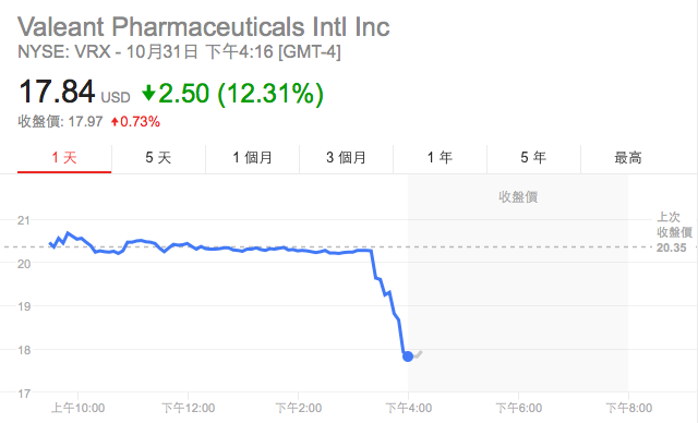 据外媒报道,针对制药巨头Valeant公司涉嫌的欺诈行为,美国曼哈顿地区检察官正对该公司前CEO Michael Pearson展开调查。受此消息影响,该公司股价尾盘大跌逾10%。