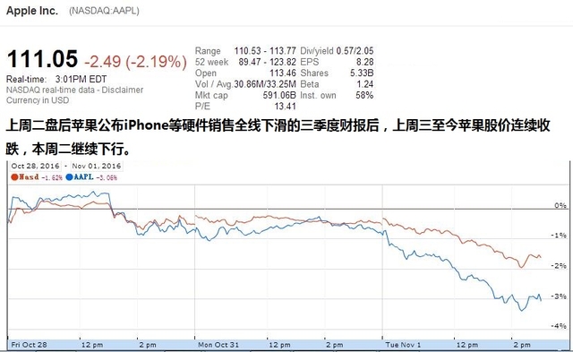 上周二苹果公布,截至今年第三季度的2016财年,公司营业收入为2156亿美元,为2001年以来首次同比下滑,三季度不但iPhone等硬件销售全线下滑,而且大中华区销售额较去年同期大跌30%。盘后公布财报后,苹果股价下跌2.8%。