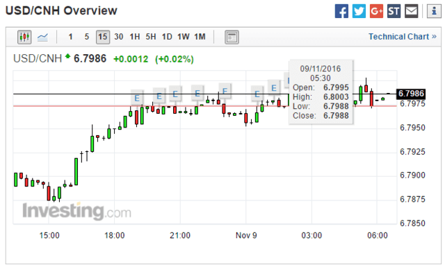 离岸人民币下跌0.02%至6.7980元,创收盘纪录新低。离岸人民币盘中一度跌破6.80关口,刷新纪录低点至6.8003元。人民日报海外版昨日发文指出,美国大选结果对人民币走势的影响不应被夸大。