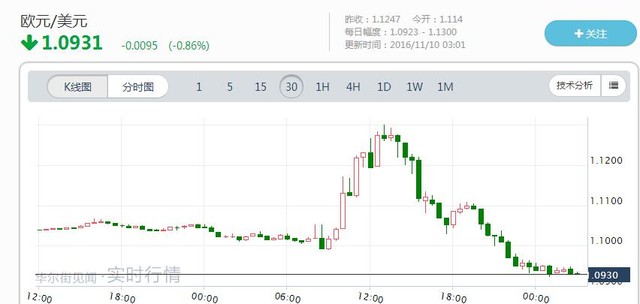 本周三欧洲交易时段早盘,特朗普获胜的消息冲击汇市,欧元对美元涨2.4%,而后全数回吐涨幅刷新日低,现已刷新上月28日以来低点至1.0931。和欧元冲高回落恰好相反,当天标普500和纳指期货均在跌停后收复日内跌幅。