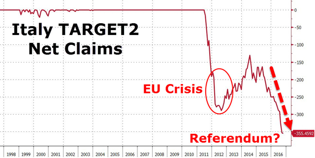 修宪公投疑虑之下,意大利的Target 2 Balance在近期同样刷新了历史记录。意大利央行对于欧元区其他国家的负债在过去两个月中飙升逾600亿欧元,目前达到了3550亿欧元这一历史新高,刷新了2012年时的纪录。
