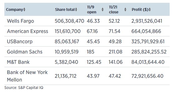 特别地,由于特朗普政策下会推升利率走高、放松监管,这利好金融行业。KBW纳斯达克银行股指数在特朗普大选成功后上涨了13.5%。巴菲特持有的金融股受益明显。