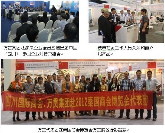 2012年11月6日——18日,由成都万贯集团、四川国际商会共同组织的四川五金行业代表团一行从成都出发赴马来西来和泰国参加“马来西亚国际五金展”及“2012泰国商会博览会”,多数商家成功实现销售业绩,并与外商初步建立合作意向,在2011年出国参展基础上又迈出了坚实的步伐,取得了喜人的成绩。