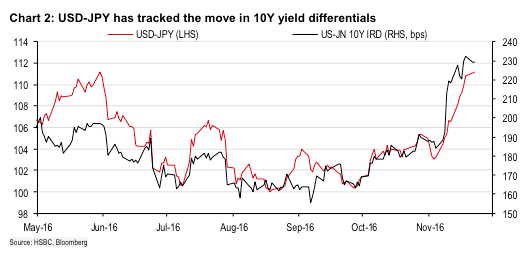 收益率上涨明显对美元上涨具有重要影响。据汇丰报告,美元对日元的走势与美日收益率利差的走势明显趋同。