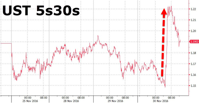 此言一出,美国长债收益率迅速飙升,幅度为特朗普意外当选后最大。30年期美债收益率一度上涨12个基点至3.06%,11月份累涨约44.85个基点。1个小时中,美国5年期国债和30年期国债息差则从115bp跃升至122bp。