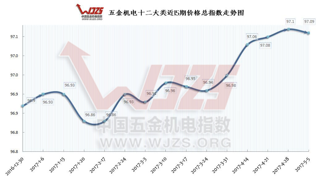 本期(2017/05/05)“中国•成都五金机电指数”(以下简称“五金机电指数”)价格总指数收于97.09点,与上期97.10点相比下跌0.01个百分点,同比去年同期96.82点上涨0.27点。