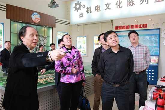 省工商联副主席袁明(前排右),巴中市政协副主席、工商联主席任晓娟(前排中)在万贯集团首席顾问冯述成(前排左)的陪同下参观万贯机电文化陈列室