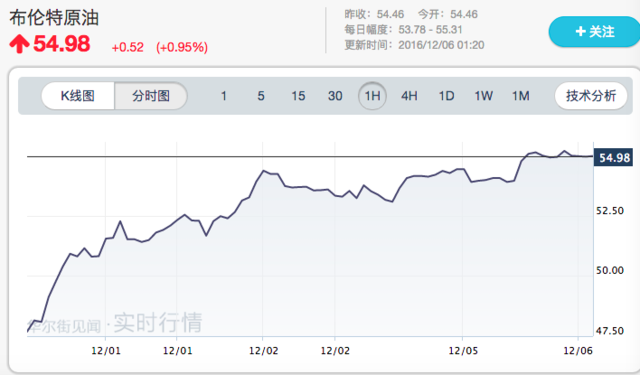 而同时,原油价格不跌反涨。周一,布伦特原油升破每桶55美元大关,创下16个月新高。