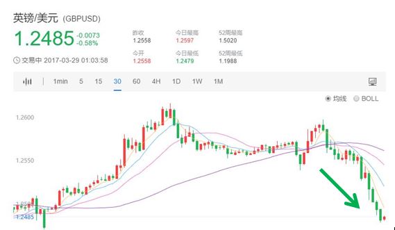 苏格兰议会原定于上周三就公投事宜投票,但因伦敦恐袭事件而推迟。由于这一消息的时点恰巧在英国正式触发退欧谈判的前一天,引发英镑兑美元汇率在周二午盘时火速下跌0.6%,接近$1.2481的两日新低。