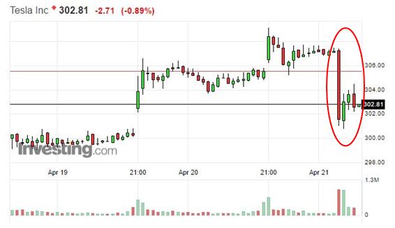 不过特斯拉股价还是在消息传出的20分钟内短线跳水3.89美元或1.25%,跌至301.63美元的日内低点。随后略有反弹,重回302美元上方。