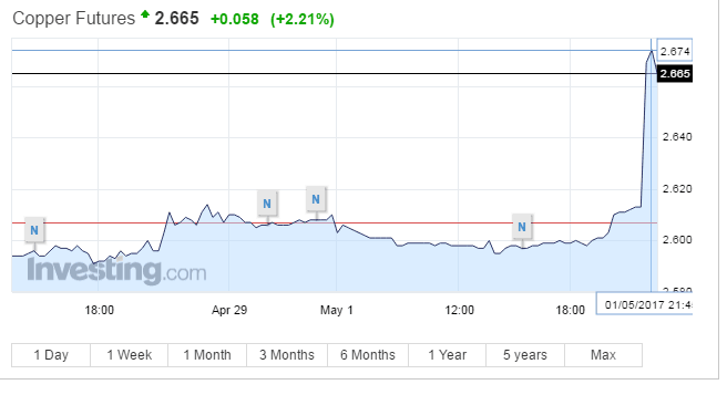 周一,受美元下跌,铜价短线迅速上涨,日内涨幅一度达2.8%。此外。位于印度尼西亚的Grasberg铜矿发生罢工事件,也对铜价构成支撑。