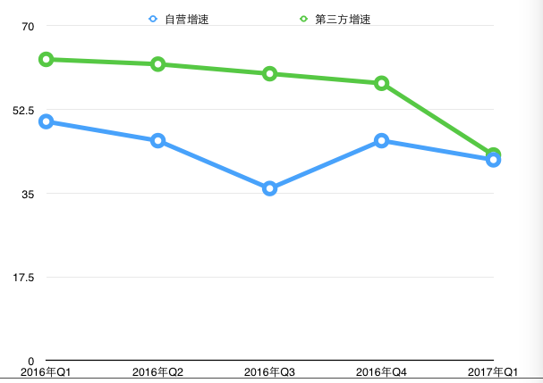 京东2017年第一季度线上自营业务交易总额为1079亿元人民币,相比去年同期增长42%。2017年第一度第三方平台交易总额为762亿元人民币,相比去年同期增长43%。自营业务和第三方业务的增速开始持平。