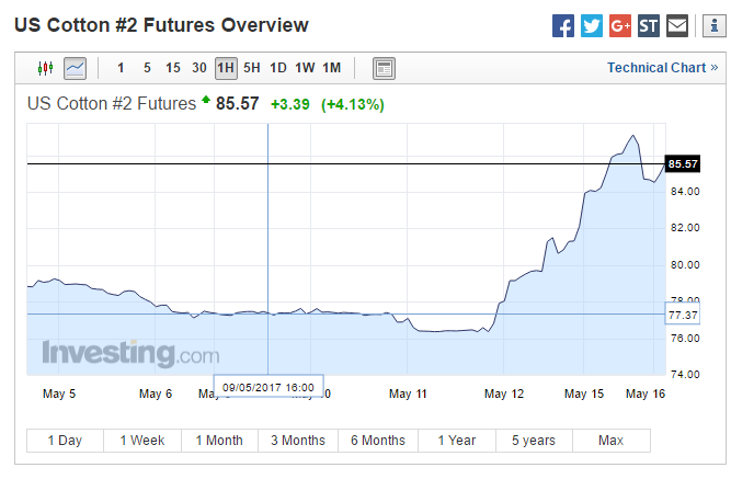 ICE7月棉花涨势如虹,5月15日美市涨超4%,三日内累计涨超10%,目前处于85.57美分/磅的高位。