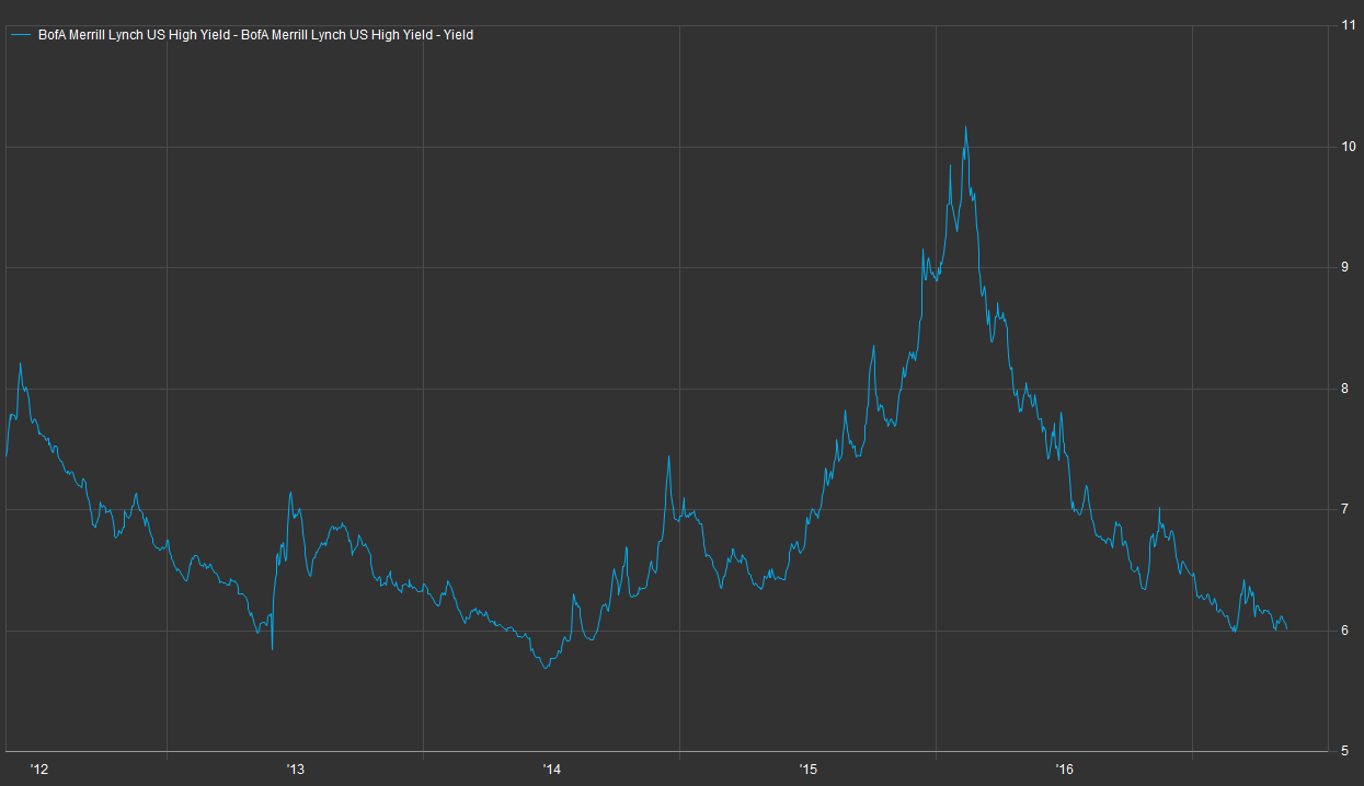美银美林的美国高收益指数显示,垃圾债收益率仅为6.02%,创下2014年6月以来的最低水平,较2016年早期10%的水平大降四成。