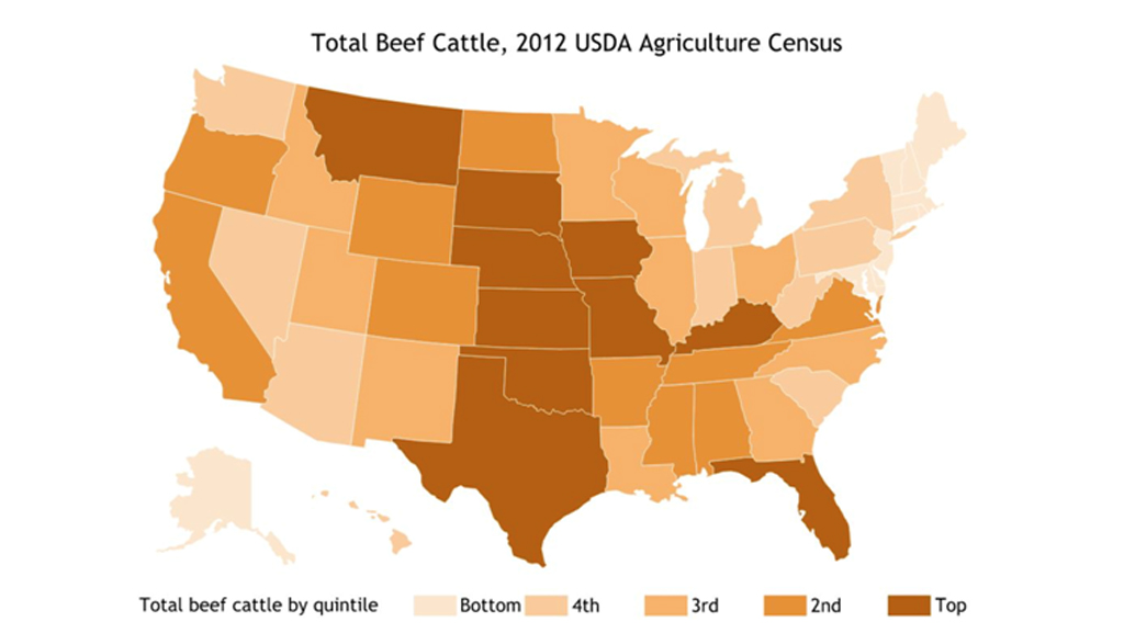 第一张图是2012年美国农业部发表的全美肉牛分布图,把美国的肉牛生产州依照数量排名分为五组,分别以颜色标志。颜色越深,便表示该州属于50州中排名越高的组别。