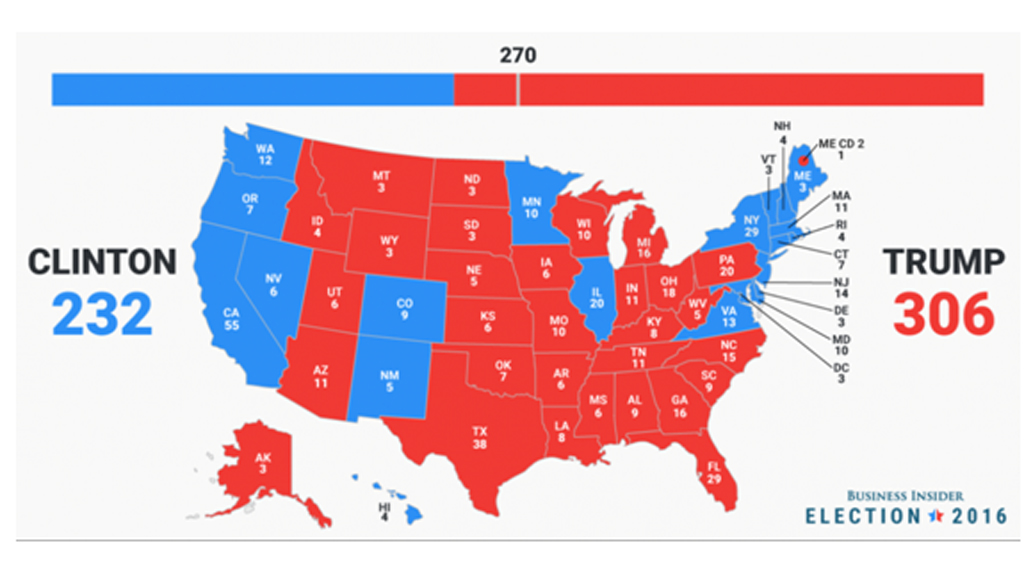 下面第二张图是2016年总统大选结果,红色的部分代表特郎普获胜的“红州”: