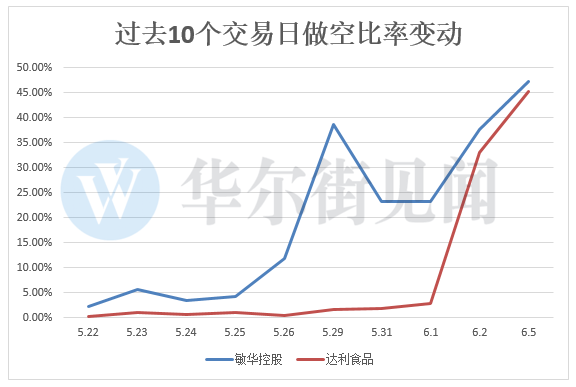 为了牟利,在做空报告发布之前,“猎物”的另一个特征就是做空比率的大涨。在最近10个交易日,敏华控股和达利食品的做空比率均有明显的上升趋势。