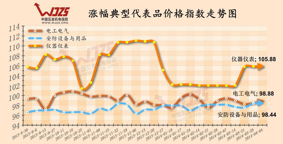 【安防设备与用品】包含头部、四肢防护产品、消防设备等,前两期3月中旬,五金机电市场整体遇采购高峰时,下游工程施工等行业对头部、四肢防护产品集中采购使得该行业价格指数连续上涨,而本期采购高峰之后,头部防护产品价格指数走入了下跌趋势。而随着气候变化,本期[消防设备]出现了上扬,价格指数小涨3.79个百分点,此外[丝网]类也涨了1.05个百分点。在此三个类别产品价格指数变化的共同影响下【安防设备与用品】本期微涨0.03个百分点。此外同样涨幅微小的还有【仪器仪表】类,本期受电网等工程需求影响,在[电工仪器]类价格指数0.08个百分点的涨幅拉动下,【仪器仪表】微幅上涨了0.02个百分点。
