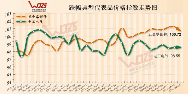 本期【五金零部件】是相对跌幅最大的一个分类,数据显示该大类下主要有三个分类价格指数变化较大,为[气动元件]、[液压元件]、[脚轮],他们分别下跌了4.86、1.26、2.69个百分点。但也有分类出现上涨情况,[轴承]类上涨了2.53个百分点。本期是4月末最后一期,从五金机电指数市场走访人员了解的情况来看,零部件前面一段时间受到钢铁价格回暖的影响价格有所上浮,但本期钢铁价格回暖态势逐渐消失,同时市场总体需求也逐渐下滑,多数厂商反映其出货量以及客户量都较前面几期有所下滑,这也是本期一些分类价格指数下跌的原因之一,本期【五金零部件】在这些分类的影响下小幅下跌0.53个百分点。