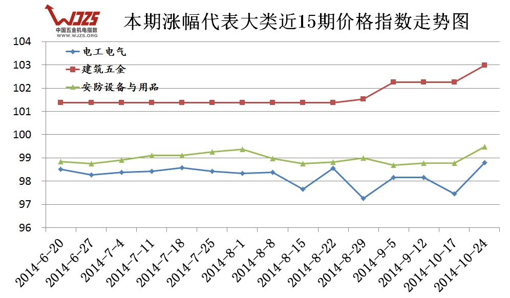 (一)涨幅分析:本期共有六大类价格指数出现上涨,涨幅相对最大的【电工电气】上涨了1.34个百分点,其他各类均涨幅不大,涨幅前三类近期走势图如下: