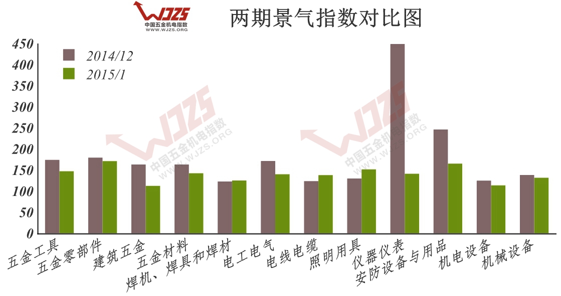 2015年1月份,从上图两期景气指数对比可以看出,多个大类景气指数环比呈现跌势,跌幅较大的主要有【仪器仪表】、【安防设备与用品】、【建筑五金】、【电工电气】几类,跌幅均超过了30点,而仅有【照明用具】、【电线电缆】、【焊机、焊具和焊材】三类景气指数有小幅度上涨,涨幅均低于30点。