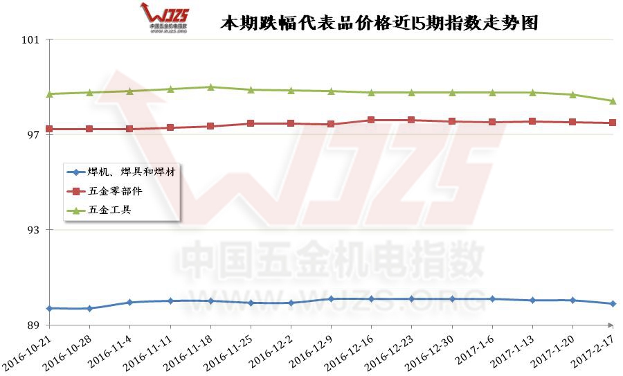 本期跌幅代表品的是【五金工具】、【焊机、焊具和焊材】、【五金零部件】类指数,分别滑落至98.42、89.89、97.49点;跌幅为0.25、0.14、0.02个点。