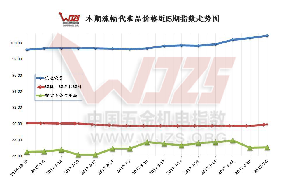 | 核心提示:本期(2017/05/05)“中国.成都五金机电指数”(以下简称“五金机电指数”)价格总指数收于97.09点,与上期97.10点相比上涨0.01个百分点,同比去年同期96.82点上涨0.27点。 |