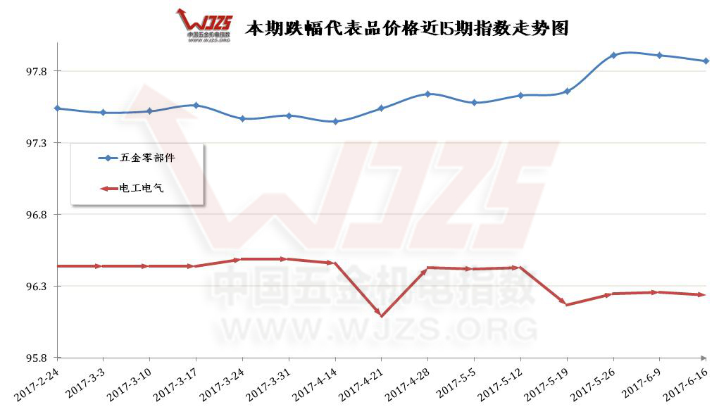 本期只有两类指数下跌,分别是【五金零部件】、【电工电气】;下跌后点数分别为97.87、96.24点,跌幅分别为0.04、0.02点。