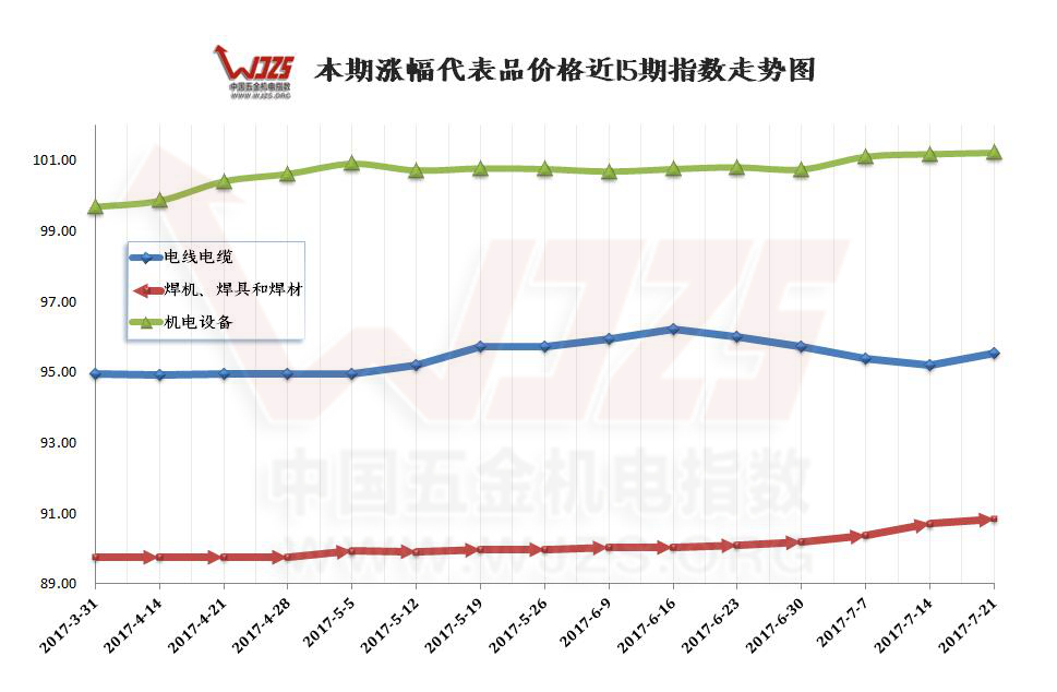 | 核心提示:本期组成“中国?成都五金机电价格总指数”的12大类价格指数呈现“6涨4跌2平”的态势。本期指数虽小幅下跌,但是整体趋势向好,涨幅类较多。其中【电线电缆】类指数上涨,上涨后点数为95.54点,涨幅为0.35点;【焊机、焊具和焊材】上涨0.15点,上涨后点数为90.84;【机电设备】上涨0.04点,上涨后点数为101.22点;本期跌幅前三位有【安防设备与用品】【五金零部件】【五金材料】类,分别下跌0.59、0.04、0.02个百分点,跌至86.43、97.92、92.78点。 |