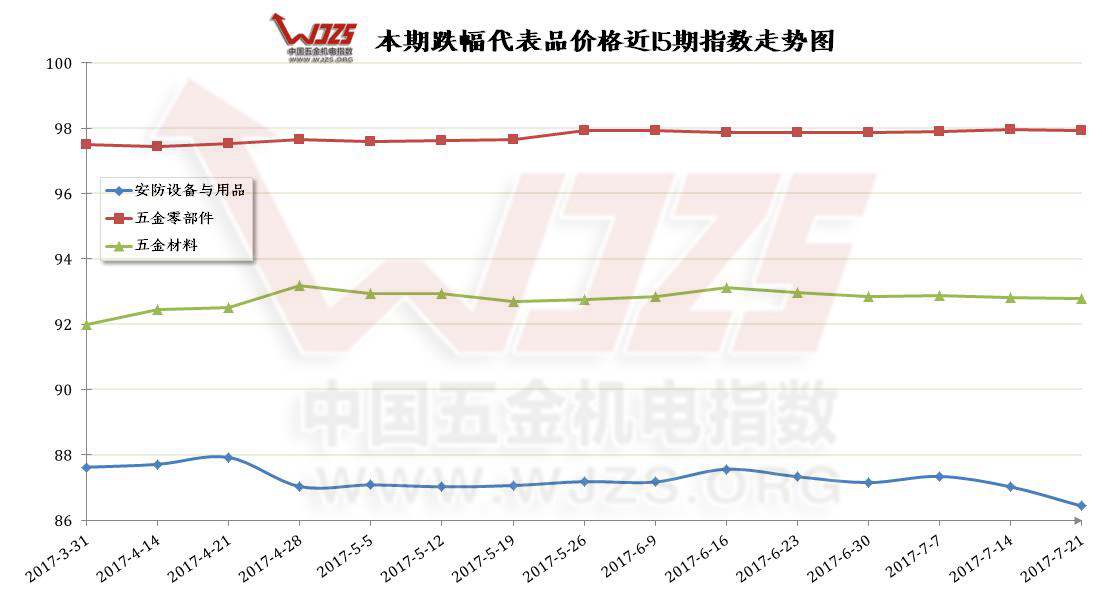 本期跌幅前三位【安防设备与用品】【五金零部件】【五金材料】类,分别下跌0.59、0.04、0.02个百分点,跌至86.43、97.92、92.78点.