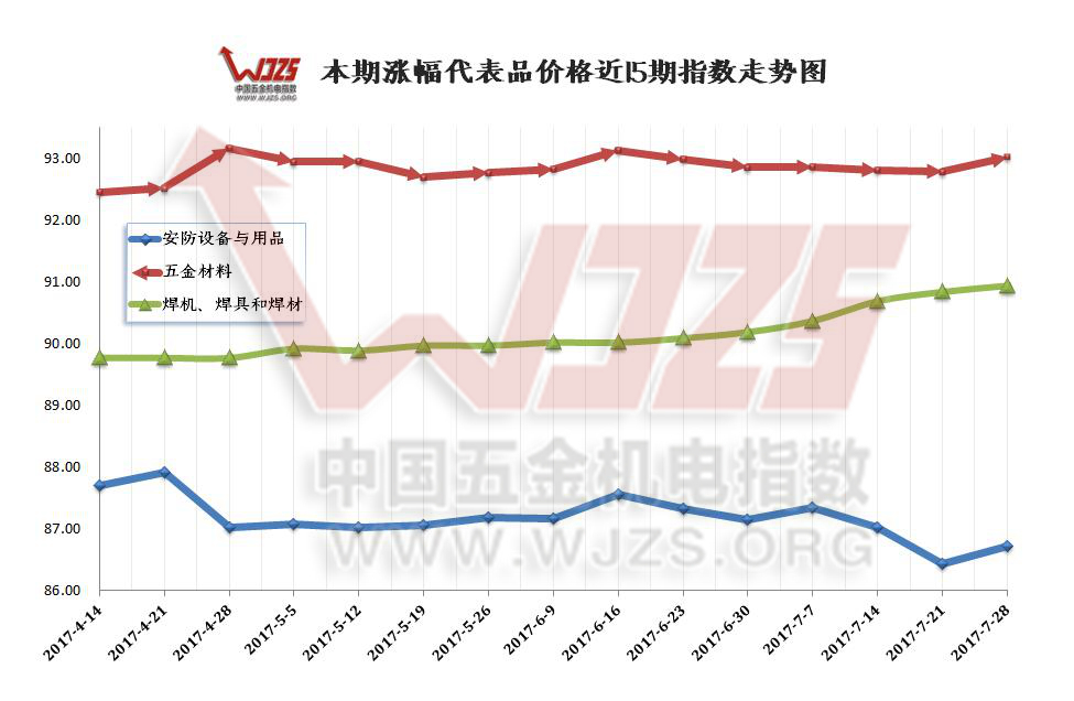 | 核心提示:本期(2017/07/28)“中国.成都五金机电指数”(以下简称“五金机电指数”)价格总指数收于97.20点,与上期97.15点相比上涨0.05个百分点,同比去年同期96.59点上涨0.61个百分点。 |