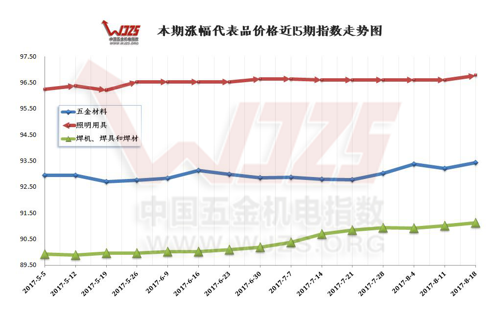 | 核心提示:本期(2017/08/18)“中国.成都五金机电指数”(以下简称“五金机电指数”)价格总指数收于97.33点,与上期97.28点相比上涨0.05个百分点,同比去年同期96.57点上涨0.76个百分点。 |