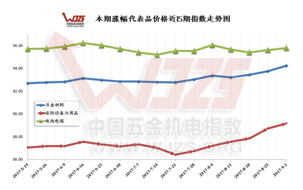 | 核心提示:本期组成“中国.成都五金机电价格总指数”的12大类价格指数呈现“5涨4跌3平”的态势。本期指数整体来看,上涨的大类较多,但是下跌单个代表品数量较多。本期涨幅前三位有:【五金材料】类指数上涨后点数为99.25点,涨幅为0.51点,【安防设备与用品】类指数上涨0.44个百分点至89.18点,【电线电缆】上涨0.19点,上涨后点数为95.80;本期跌幅前三位分别是【照明用具】、【机电设备】、【焊机、焊具和焊材】类,分别下跌0.08、0.07、0.06个百分点,跌至96.7、101.08、91.02点。 |