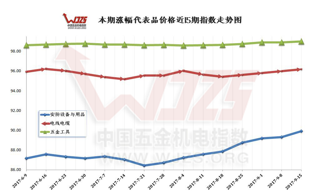 | 核心提示:本期组成“中国.成都五金机电价格总指数”的12大类价格指数呈现“7涨2跌3平”的态势。本期涨幅前三位有:【安防设备与用品】类指数上涨后点数为89.9点,涨幅为0.58点,【电线电缆】类指数上涨0.21个百分点至96.19点,【五金工具】上涨0.09点,上涨后点数为99;本期跌幅两位分别是【焊机、焊具与焊材】、【机械设备】 |