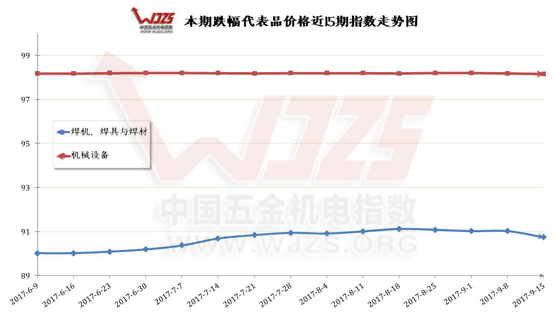 | 核心提示:本期组成“中国.成都五金机电价格总指数”的12大类价格指数呈现“7涨2跌3平”的态势。本期涨幅前三位有:【安防设备与用品】类指数上涨后点数为89.9点,涨幅为0.58点,【电线电缆】类指数上涨0.21个百分点至96.19点,【五金工具】上涨0.09点,上涨后点数为99;本期跌幅两位分别是【焊机、焊具与焊材】、【机械设备】 |