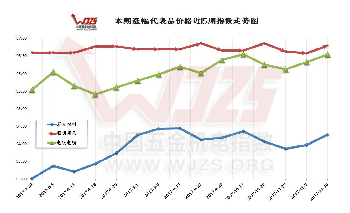 | 核心提示:本期价格总指数收于97.79点,与上期97.76点相比小涨0.03点,同比去年同期96.63点上涨1.16个百分点。组成“中国?成都五金机电价格总指数”的12大类价格指数呈现“7涨4跌1平”的态势。本期涨幅前三位有:【五金材料】类指数上涨后点数为94.26点,涨幅为0.29点,【照明用具】类指数上涨0.22个百分点至96.8点,【电线电缆】上涨0.21点,上涨后点数为96.54;本期跌幅前三位分别是【安防设备与用品】下跌0.36点,跌至89.72点,【五金工具】类下跌0.12个百分点至99.15,【焊机、焊具与焊材】本期90.79点,下跌0.1个百分点。 |