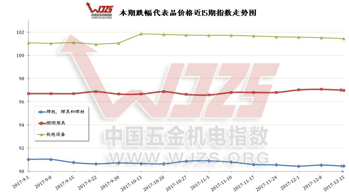 | 核心提示:本期价格总指数收于97.73点,与上期97.64点相比上涨0.09点,同比去年同期96.81点上涨0.92个百分点。组成“中国?成都五金机电价格总指数”的12大类价格指数呈现“6涨5跌1平”的态势。本期涨幅前三位是:【安防设备与用品】类指数上涨后点数为88.60点,涨幅为0.52点,【电线电缆】类指数上涨0.38个百分点至96.98点,【五金材料】上涨0.29个百分点至94.46点;本期跌幅前三位分别是【焊机、焊具和焊材】下跌0.09点,跌至90.44点,【照明用具】类下跌0.09个百分点至96.98,【机电设备】本期101.45点,下跌0.08个百分点。 |