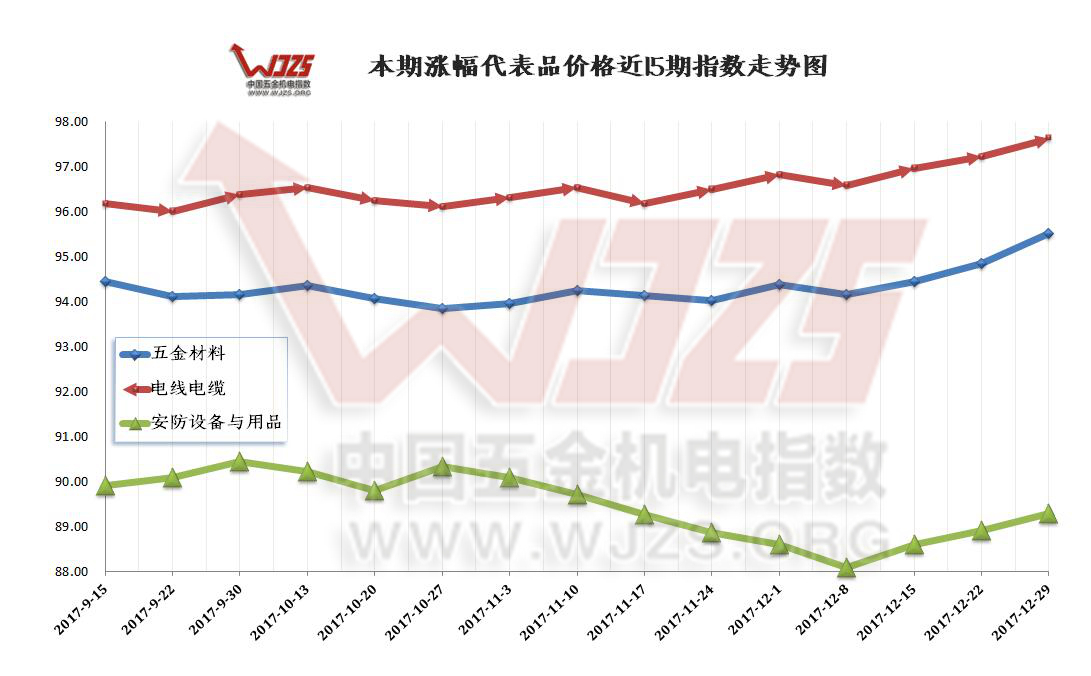 | 核心提示:本期价格总指数收于97.87点,与上期97.80点相比上涨0.07点,同比去年同期96.89点上涨0.98个百分点。12大类价格指数呈现“5涨7跌0平”的态势。本期涨幅前三位是:【五金材料】类指数上涨后点数为95.52点,涨幅为0.66点,【电线电缆】类指数上涨0.42个百分点至97.65点,【安防设备与用品】上涨0.39个百分点至89.29点;本期跌幅前三位分别是【照明用具】下跌0.3点,跌至96.92点,【机电设备】类下跌0.17个百分点至101.25,【电工电气】本期95.88点,下跌0.16个百分点。 |