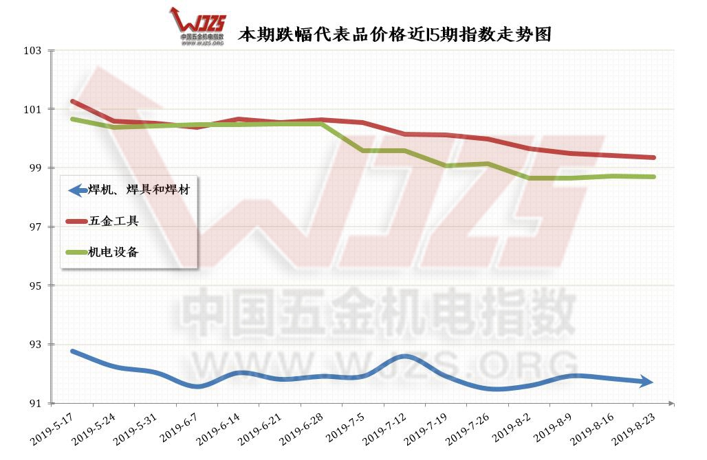 | 核心提示:本期价格指数收于98.84点与上期相比上涨0.04个百分点,同比上涨0.25%。12大类呈现“5涨4跌3平”态势。本期涨幅前三类产品是:【安防设备与用品】【建筑五金】【电工电气】;本期下跌指数前三类产品,分别是【焊机、焊具和焊材】【五金工具】【机电设备】…… |