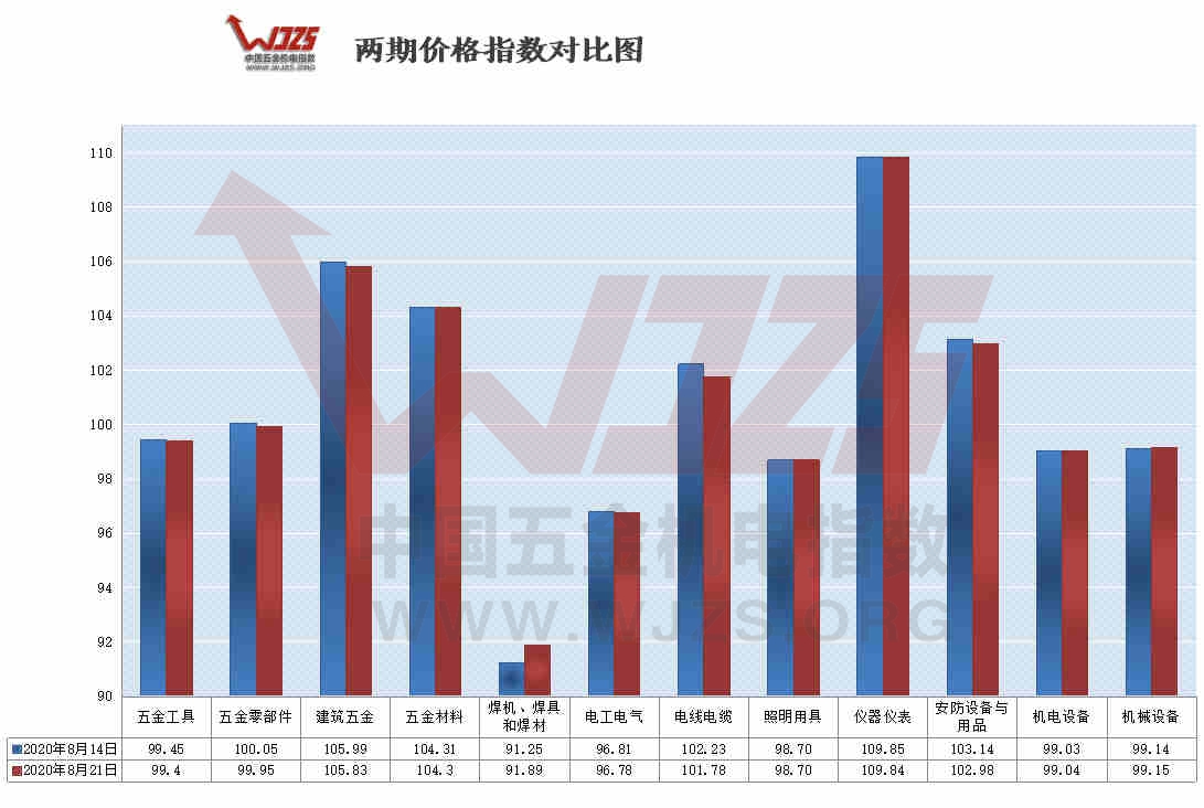 | 核心提示:本期价格指数收于100.80下跌涨0.03个百分点,同比上涨2%。12大类价格指数呈现“3涨8跌1平”的态势。本期涨幅前三类产品是:【焊机、焊具和焊材】【机电设备】【机械设备】;本期下跌指数前三类产品,是【电线电缆】【安防设备与用品】【建筑五金】 |