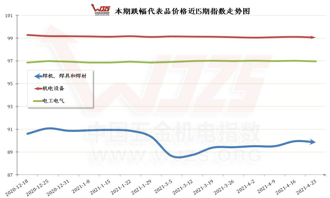 | 核心提示:本期价格指数收于103.62点上涨0.43点,同比上涨3.84%。12大类呈“5涨3跌4平”态势。本期涨幅前三类产品是:【五金工具】【安防设备与用品】【五金材料】;本期下跌指数前三类产品,是【焊机、焊具和焊材】【机电设备】【电工电气】…… |